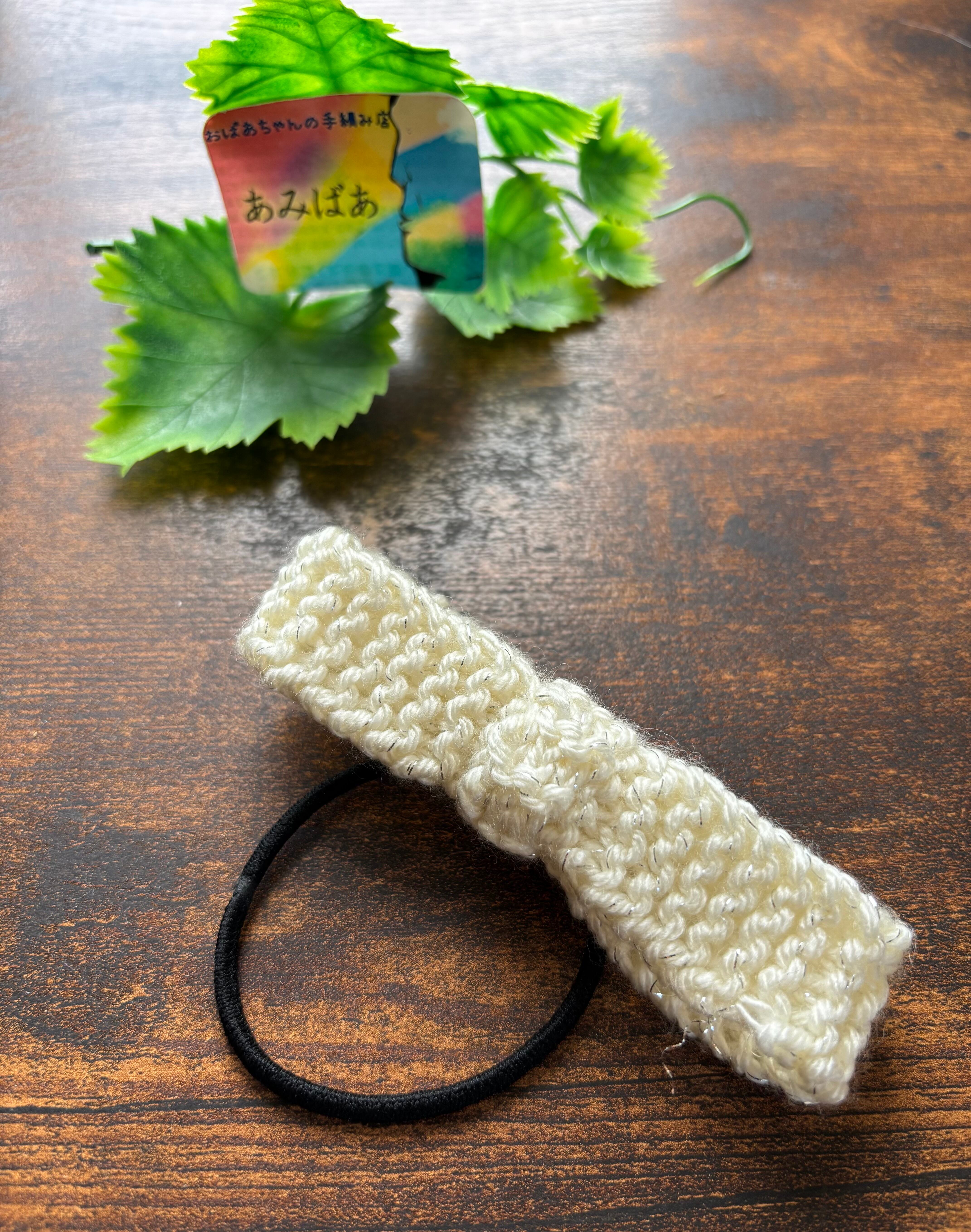 ちいさなリボンも可愛いと思い、あみばあに編んでもらいました。白い毛糸を使ったので上品なデザインになりました。派手すぎないので幅広い年齢の方にご利用いただけるかと思います。