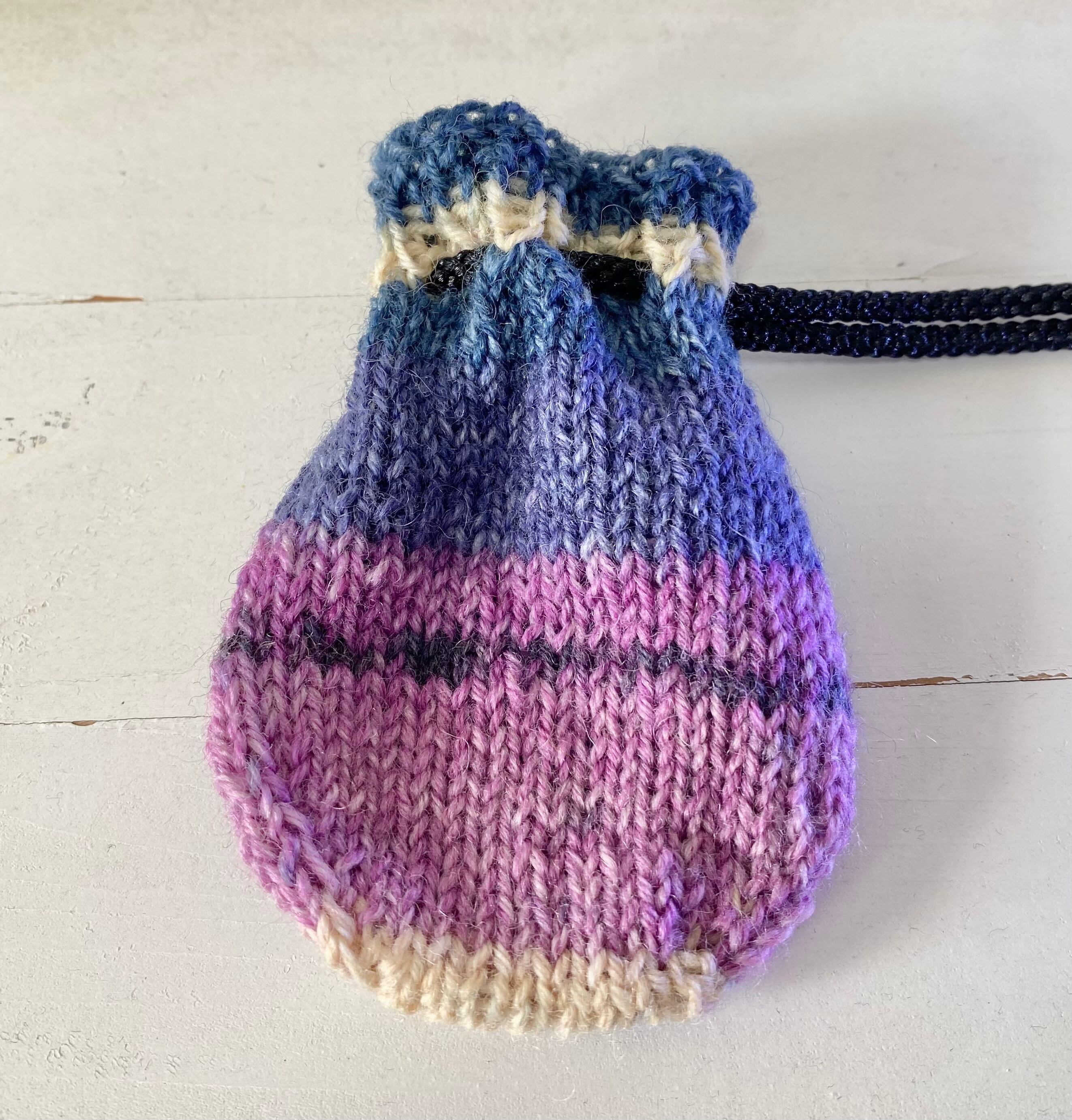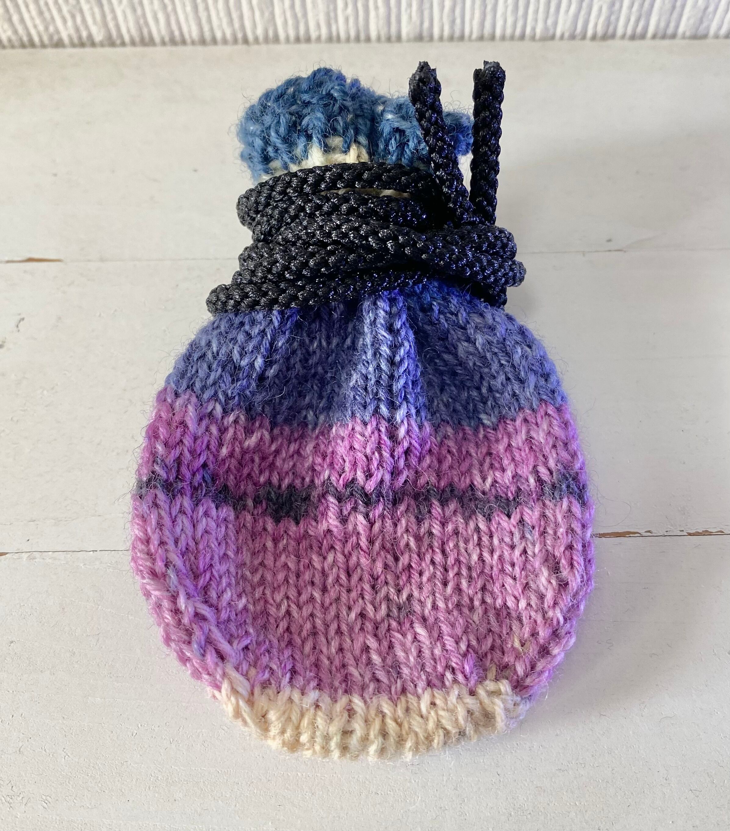 あみばあが好きな、棒針編みで編んだ小さな巾着です。紐はご自身で工夫出来るように、長めにとってあります。長めにカットして端はボンドでとめてあります。ブルーパーブルのほうが一回り小さくなってます。当店のブルーパーブルやブラックホワイトより、少し太めの紐を使用してみました。