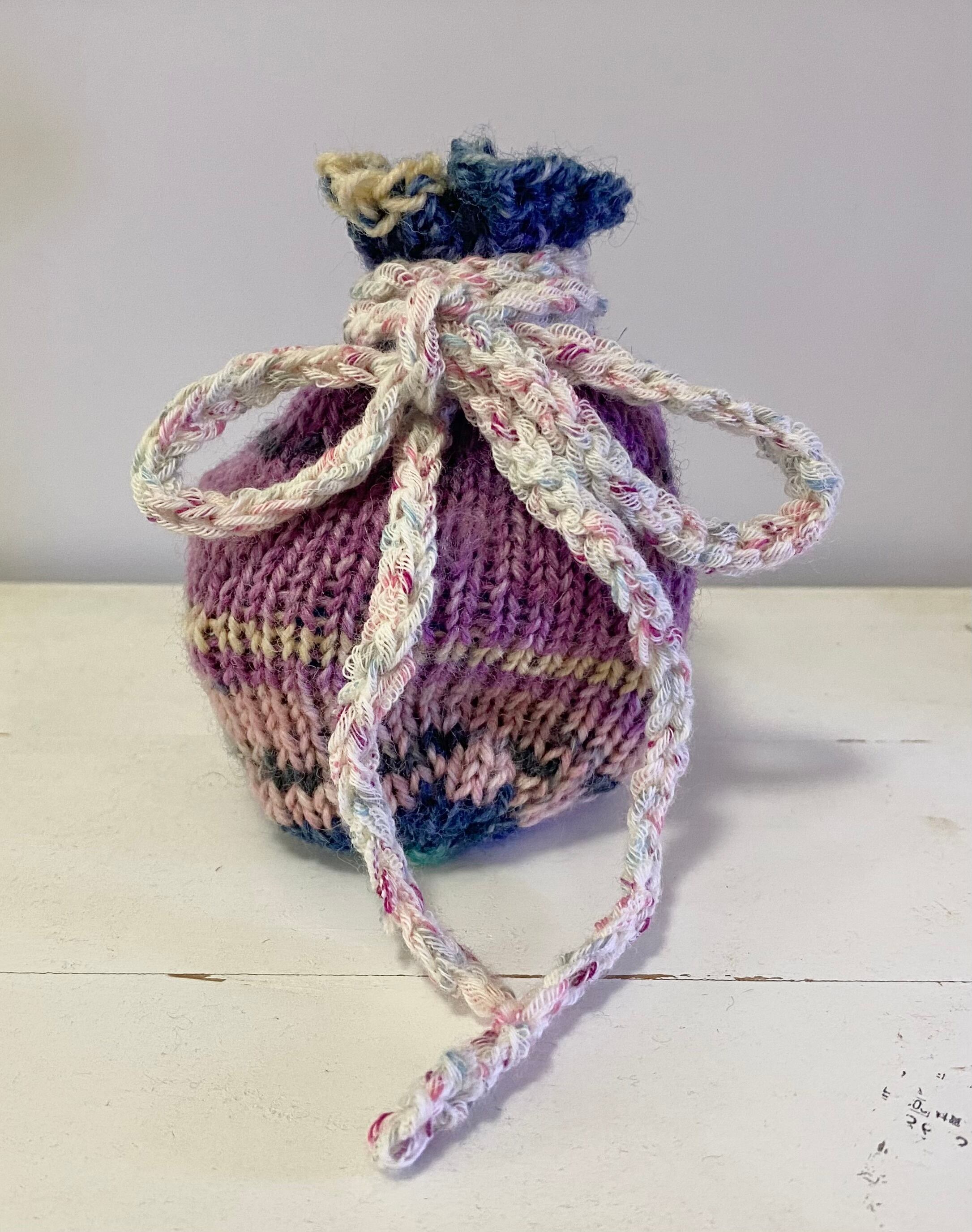 あみばあが好きな、棒針編みで編んだ小さな巾着です。スレッドコード編みを動画で見て勉強して編んでみました。紐は長めに編んであります。小さめですのでイヤホンやお菓子、お薬など、小物整理にいかがでしょうか?ちなみにあみばあは、髪の毛を束ねて巾着をかぶせています。
