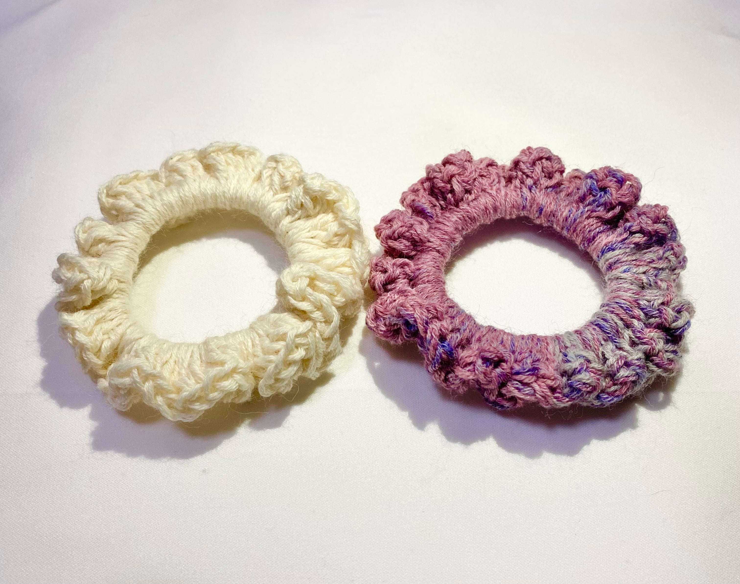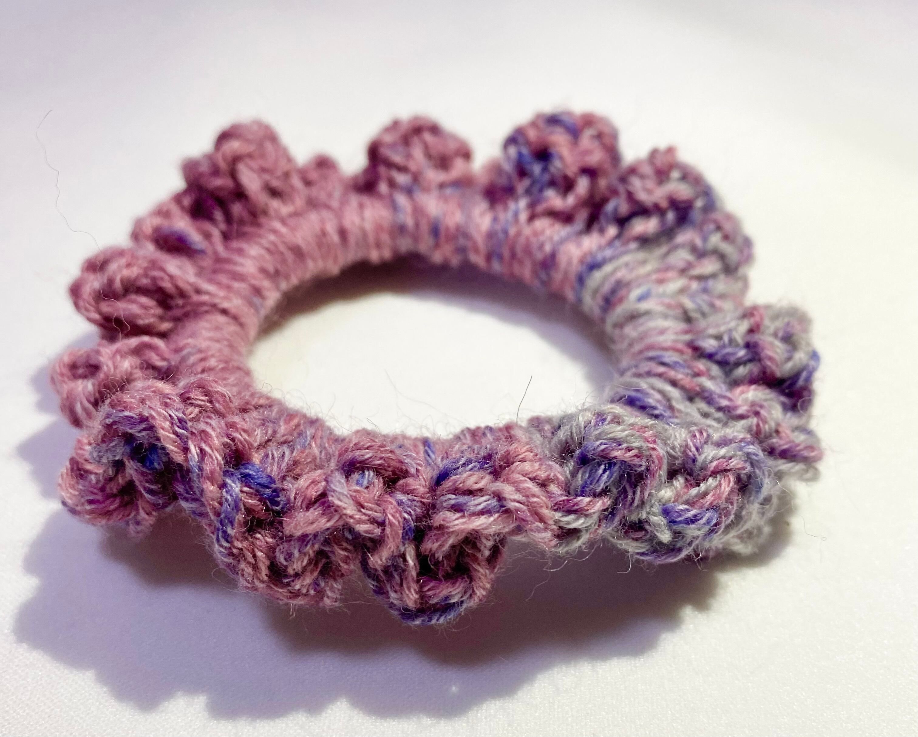 黒いリングゴムに長編みで編みつけてます。目の悪い70歳のおばあちゃんが編んだ作品です。温かみのある作品に仕上がっているかと思いますが、多少の歪みがある事をご理解ください。