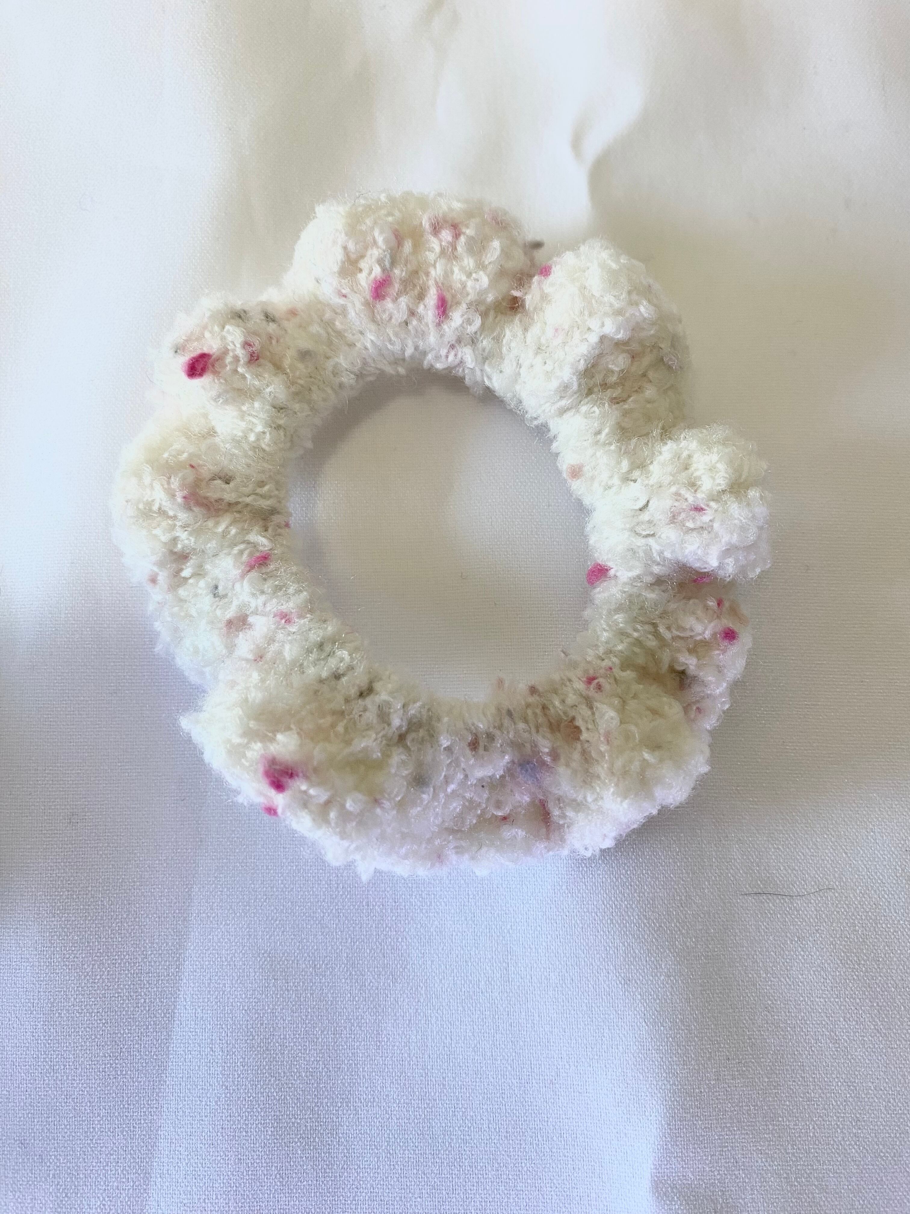黒いリングゴムに長編みで編みつけてます。目の悪い70歳のおばあちゃんが編んだ作品です。温かみのある作品に仕上がっているかと思いますが、多少の歪みがある事をご理解ください。